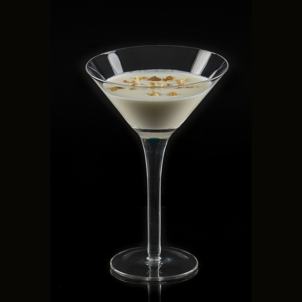 Put the ingredients into a shaker. Shake and serve in a cocktail glass. Garnish with nut.